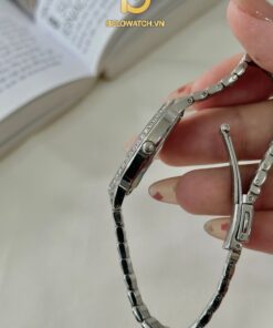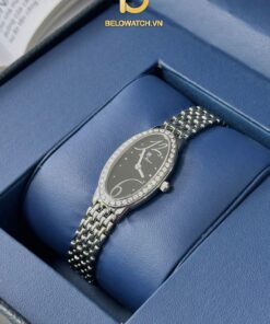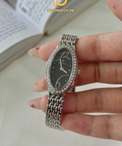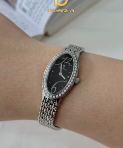 OLYM PIANUS OP2460L dáng mặt oval với nền dial đen được làm nổi bật bằng 12 viên kim cương nhỏ thay thế cho 12 nút giờ. Dây kim loại màu bạc thanh mảnh, phù hợp cho các nàng có cổ tay nhỏ.