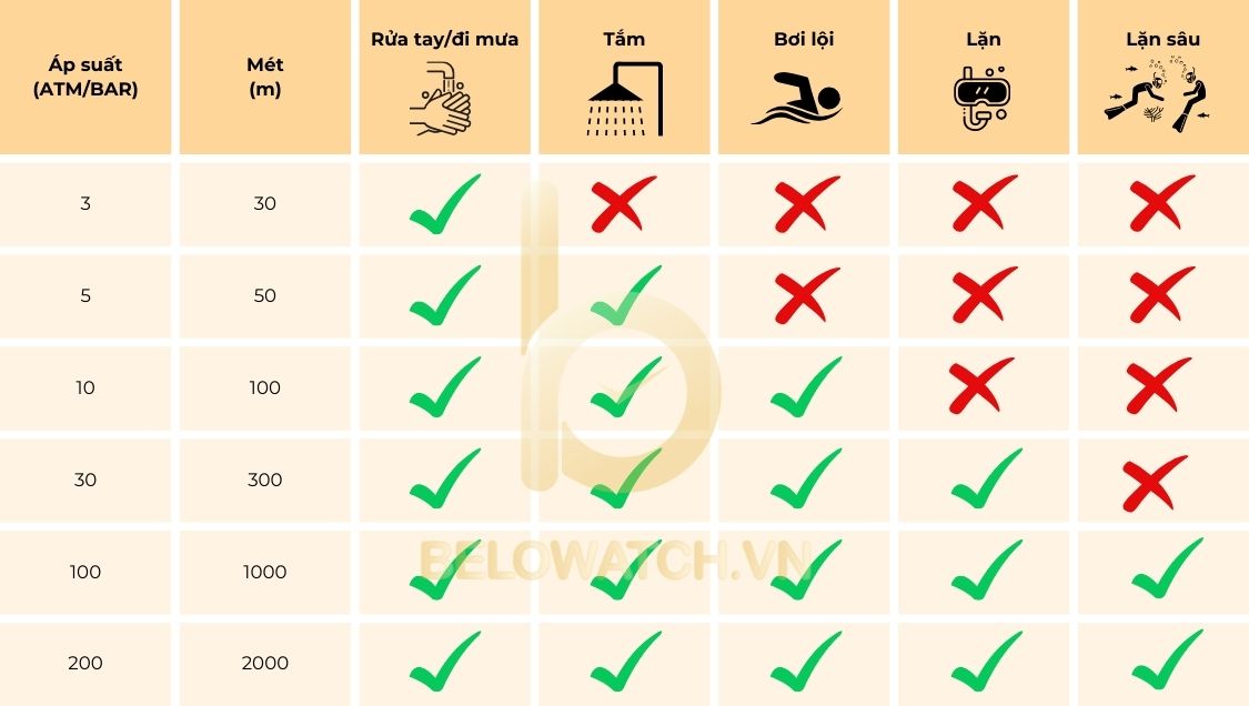 Dưới đây là bảng ghi chú một số chỉ số chống nước thường gặp ở đồng hồ và mức độ chống nước thực tế bạn có thể tham khảo.
